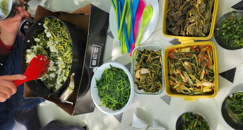 윤 시인의 나물과 허정분 시인에게 받아온 선물.