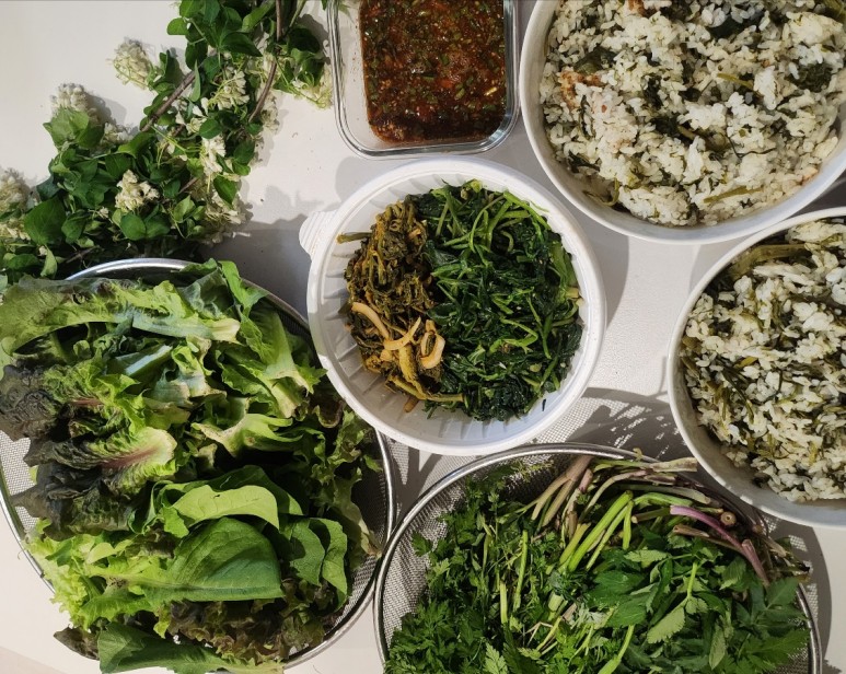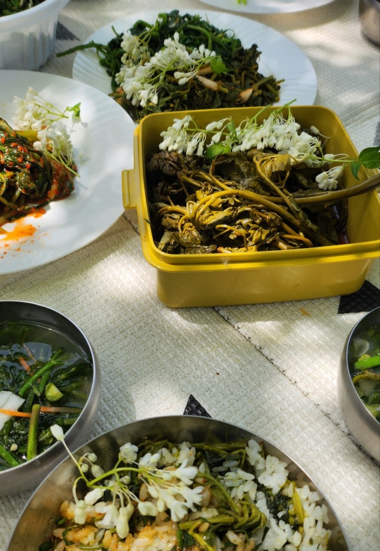 오이나무 꽃을 곁들여 꽃밥과 꽃나물까지. 오이나무라니... 처음 봤다. 꽃맛이 순하다.