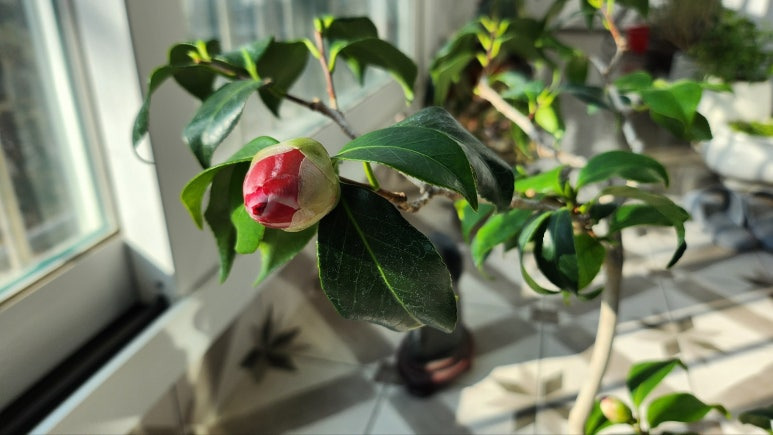 올해는 동백꽃 봉오리 다섯 개가 맺혔다.
