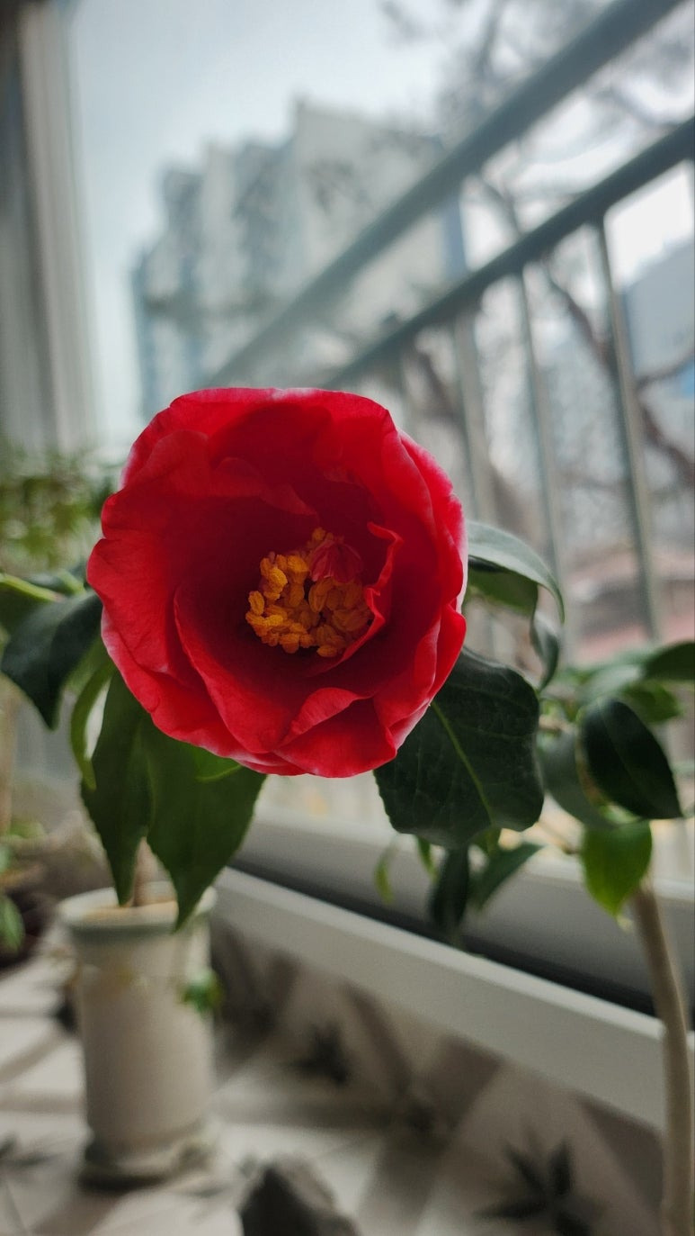 훌러덩 꽃바침까지 젖혔다. 동백이 이리 활짝 피는 건 흔한 일이 아니다.