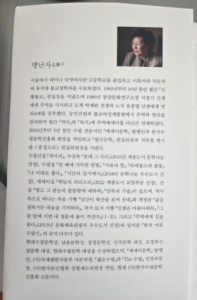 * 1969년부터 <신행불교>의 편집 일을 맡아 10년간 봉직하는 동안 언론 매체에서 청탁이 왔고 발표된 글에는 '수필가'라는 호칭이 뒤따랐다. 이름의 도盜가 되지 않으려고 노력해서 나는 수필가가 되었고 1996년 첫 수필집 『빈배에 가득한 달빛』 을 출간하였을 때 법정 스님께서 보내주신 엽서에는 낯익은 만년필의 굵은 글씨로 이렇게 씌어 있었다.